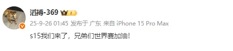 虎扑09月26日讯 战胜IG晋级世界赛后,TES上单选手369发文:"s15我们来了,兄弟们世界赛加油! " 来源:微博 虎扑09月26日讯 战胜IG晋级世界赛后,TES上单选手369发文:"s15我们来了,兄弟们世界赛加油! " 来源:微博