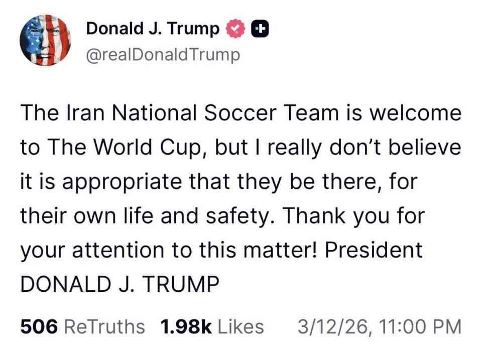 北京时间3月12日,在距离世界杯开幕仅剩90天时,美国总统特朗普在社媒发文,发表了自己对伊朗男足国家队参加美加墨世界杯的看法。